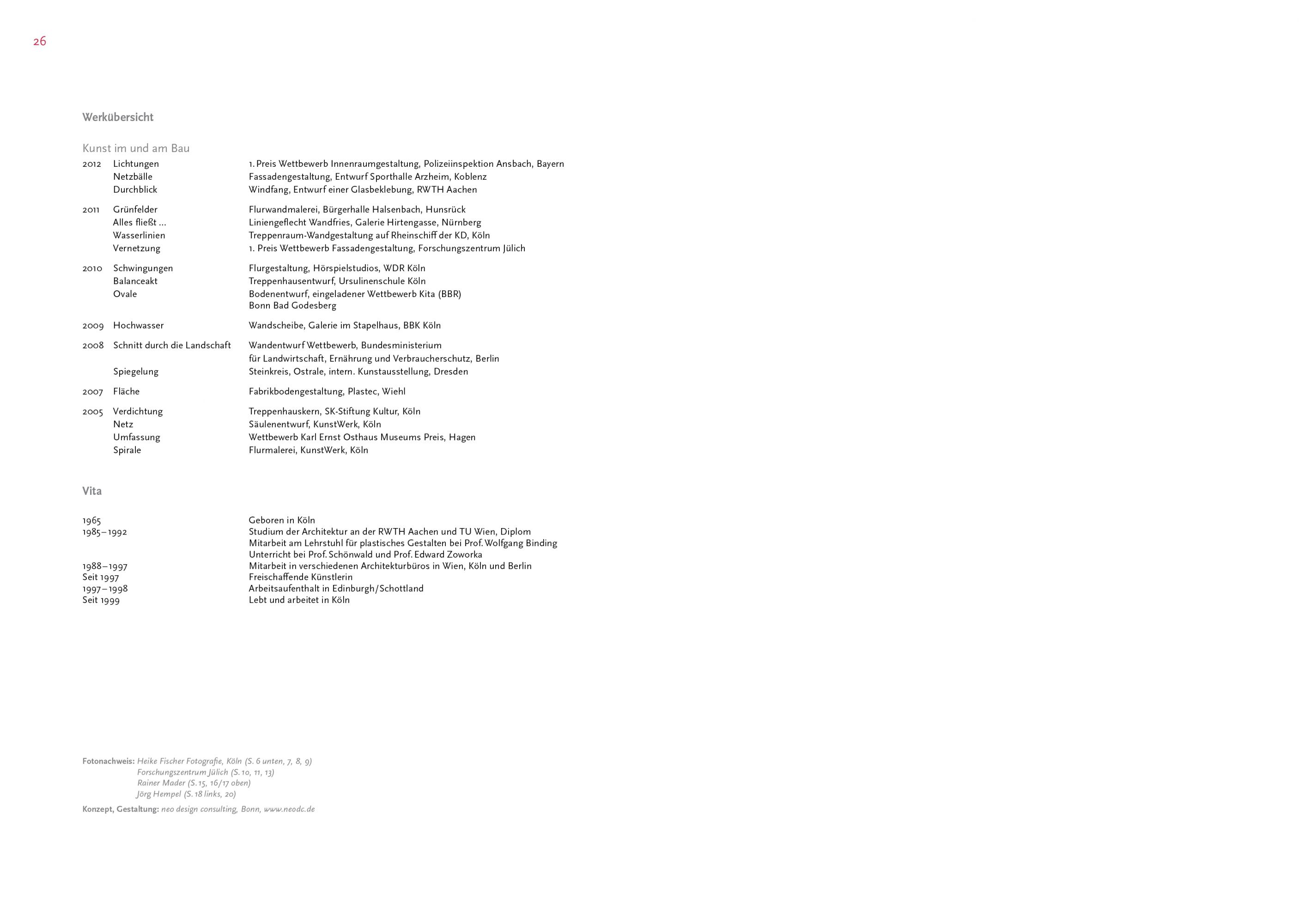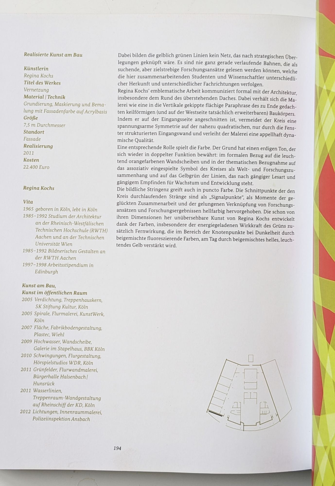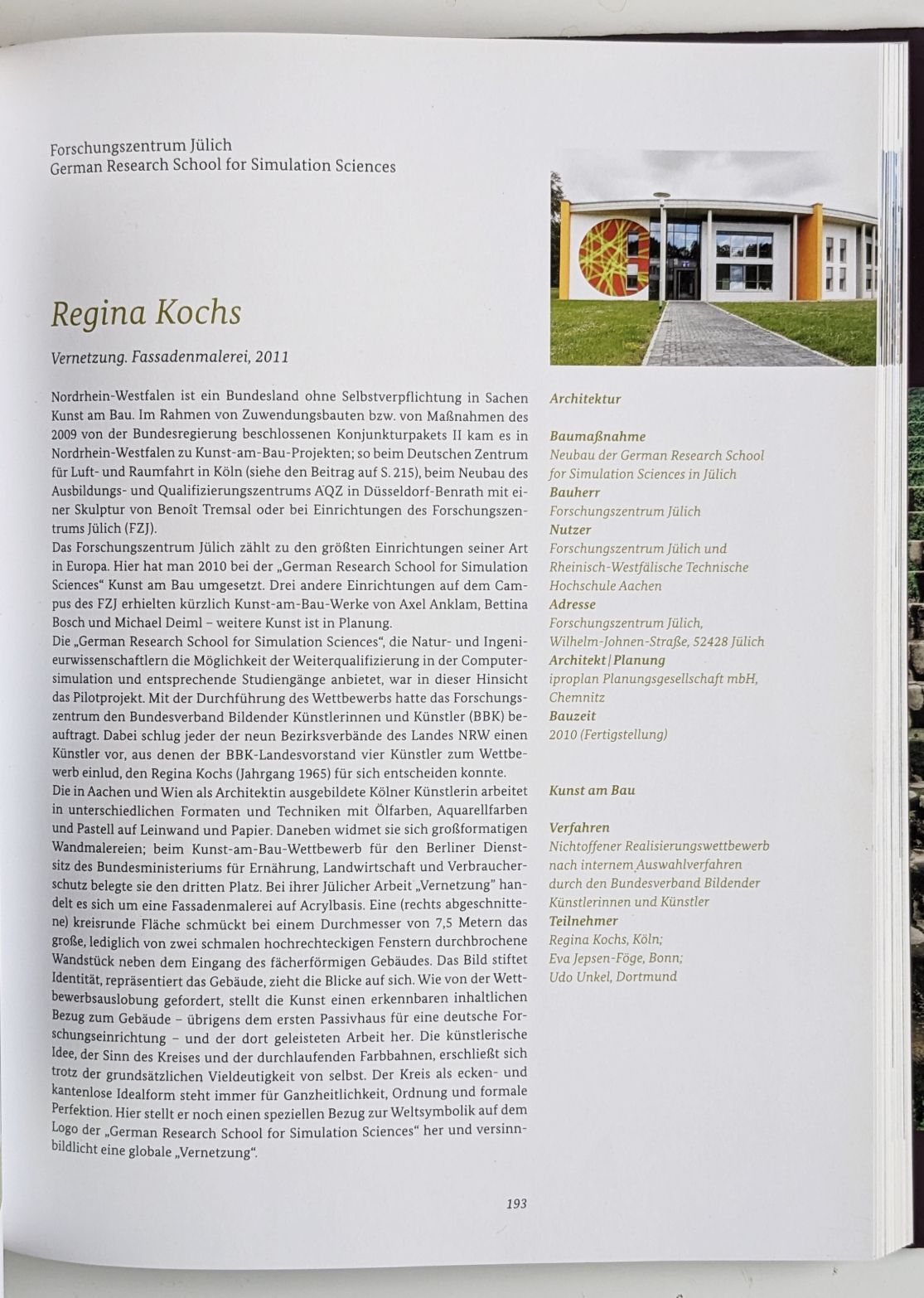 "Vernetzung" S. 192-195 in "Kunst am Bau, Projekte des Bundes 2006-2013" eine ausführliche Dokumentation von knapp 60 realisierten Werken. Herausgeberin: BM für Umwelt, Naturschutz, Bau und Reaktorsicherheit, Redaktion: BBR. Berlin 2014. ISBN 978-3-86859-246-7