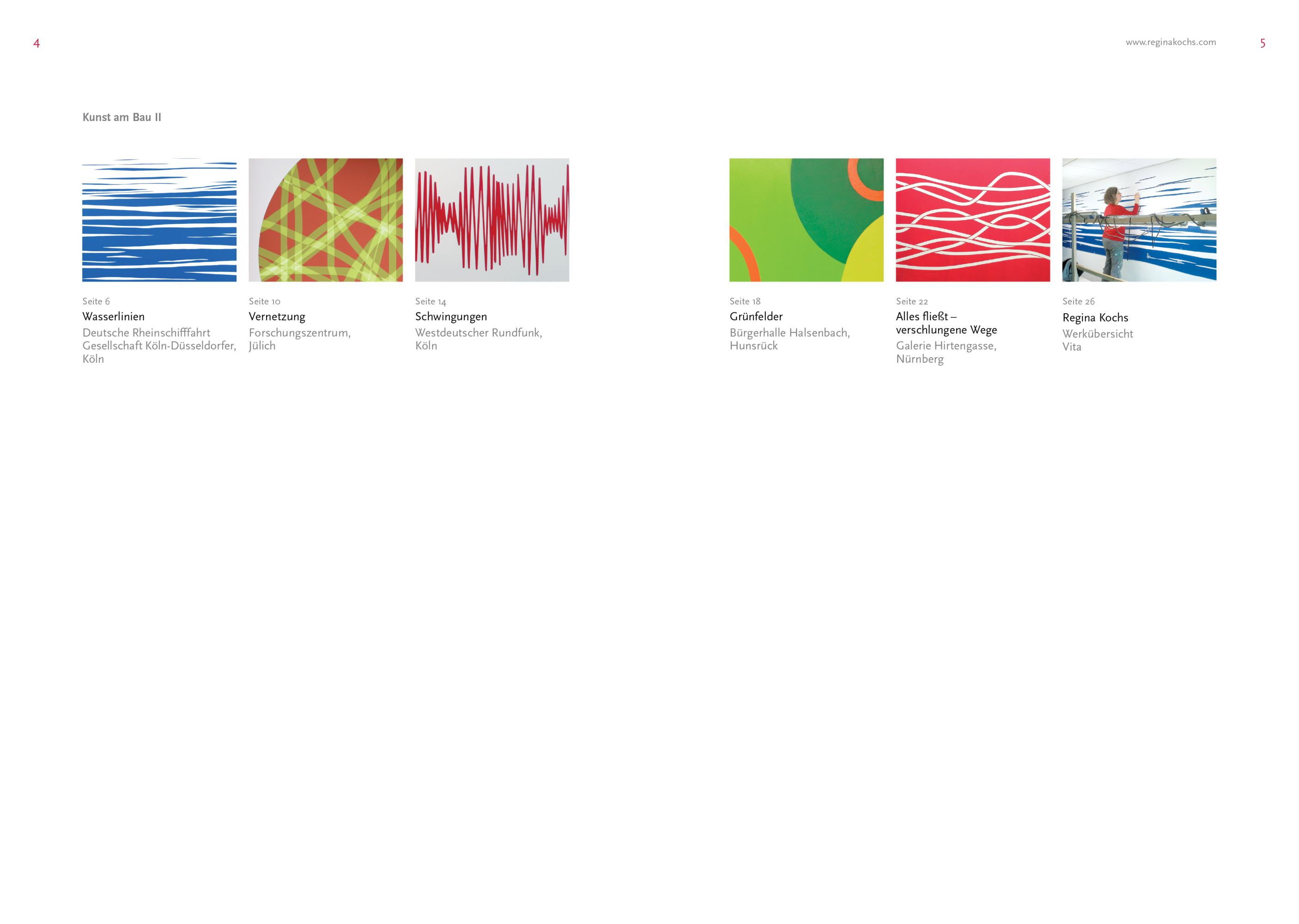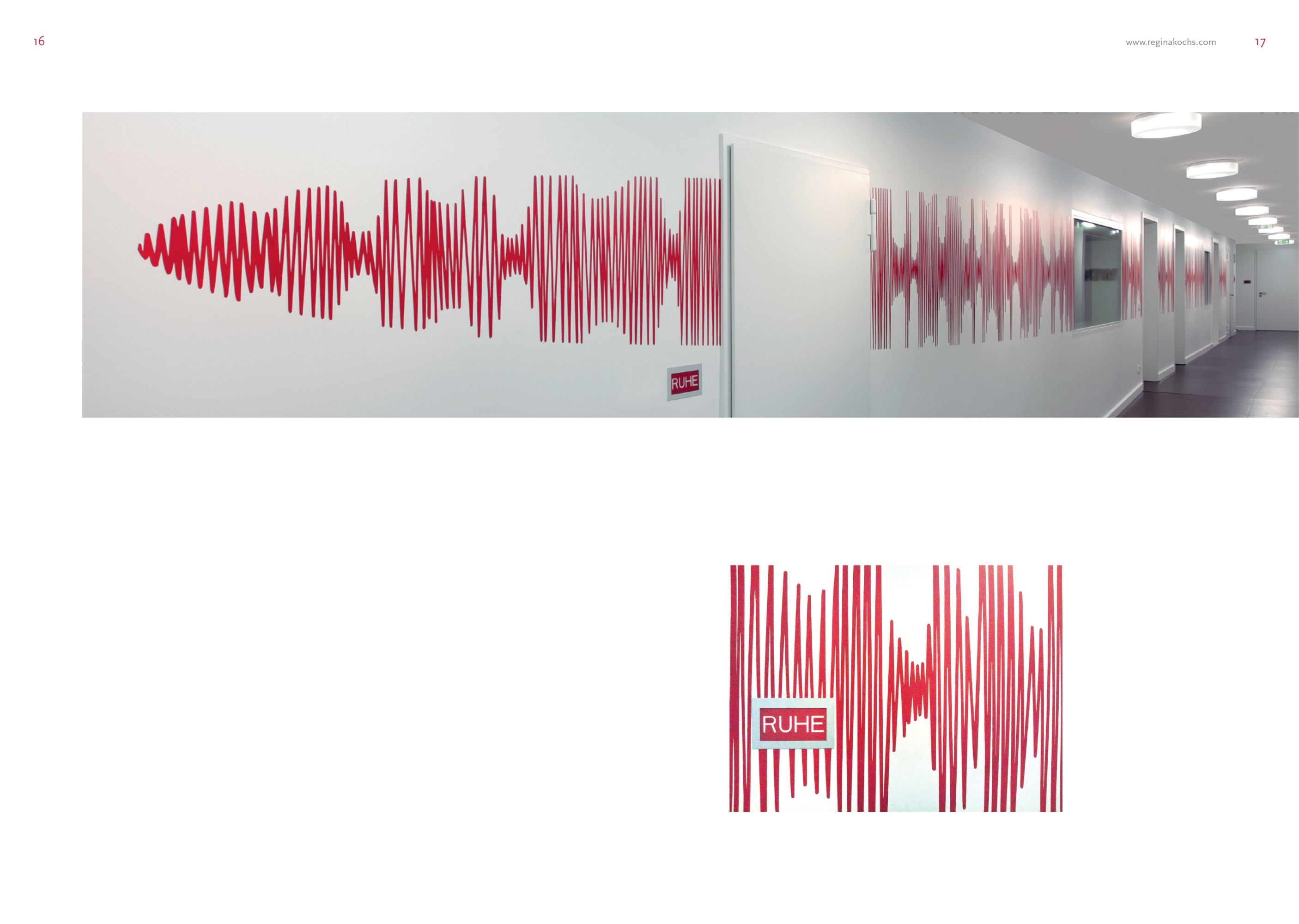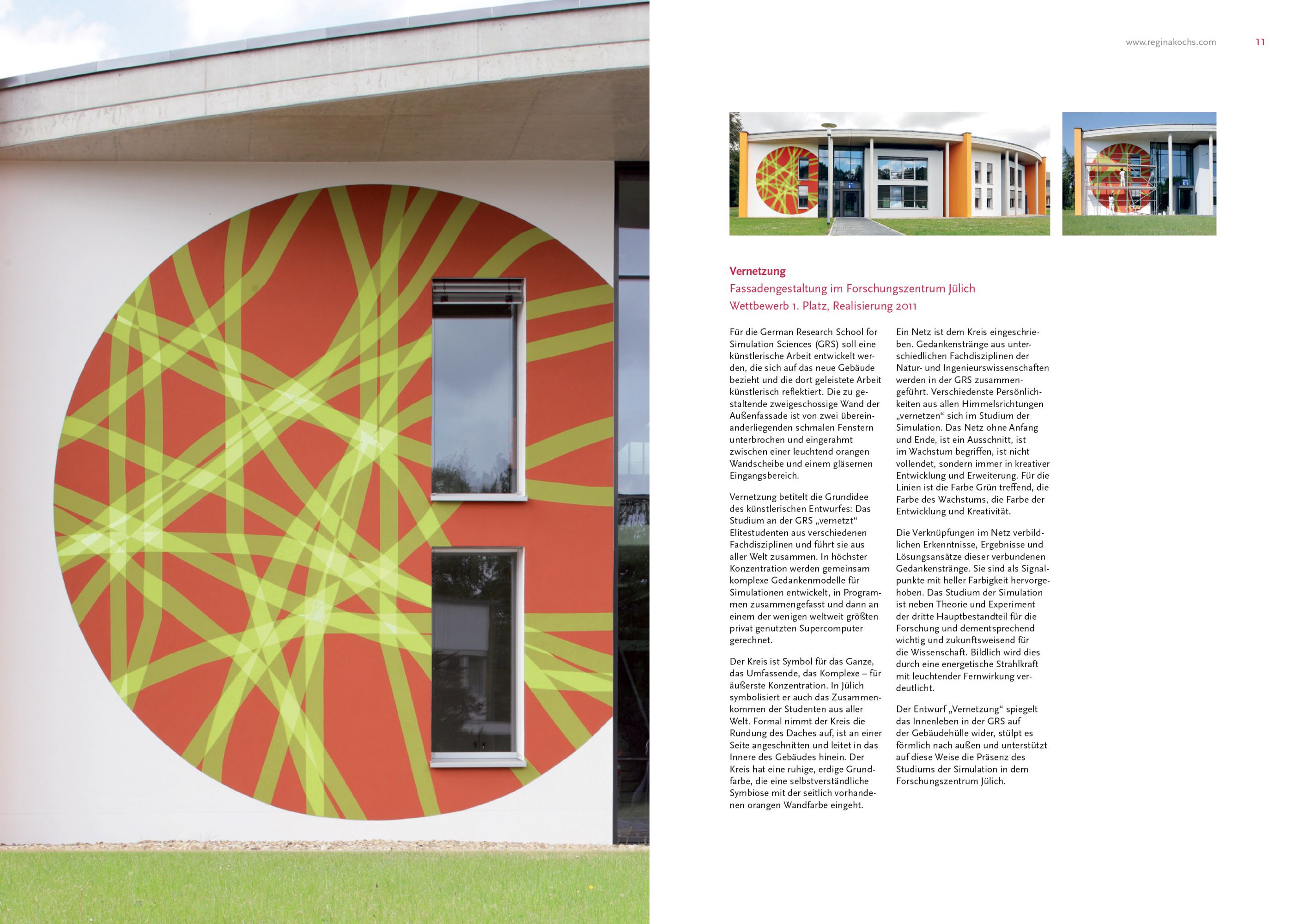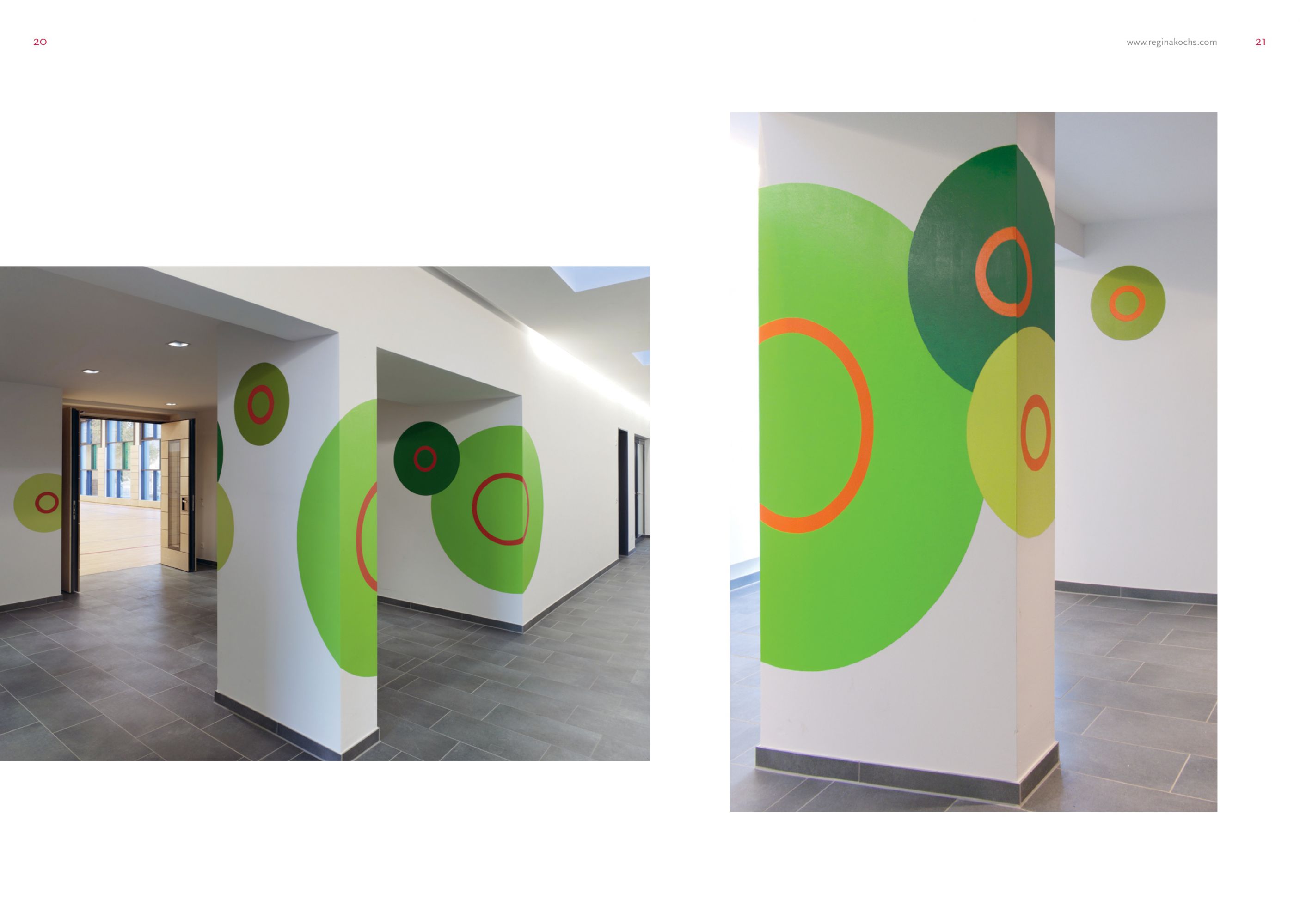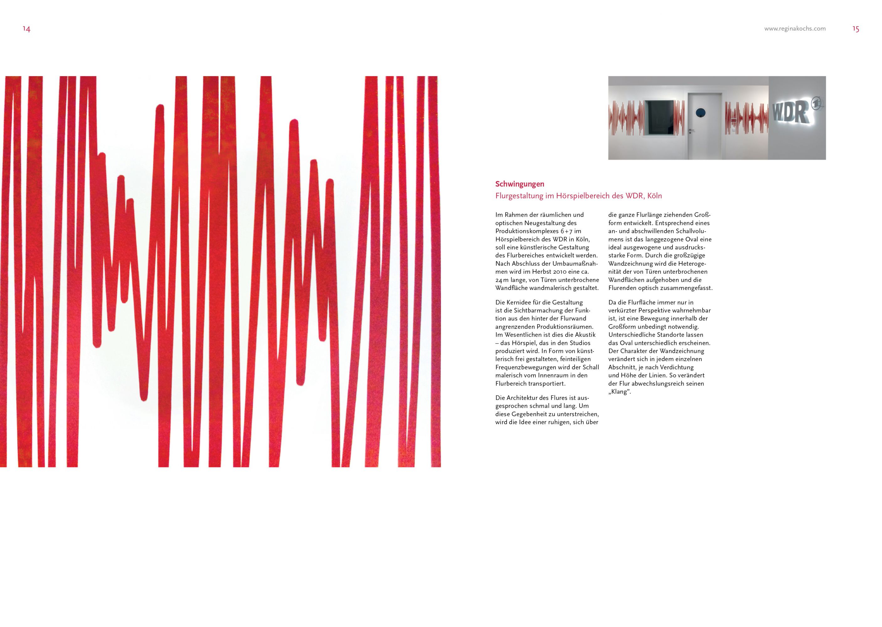 Die Flur begleitende Malerei "Schwingungen" für die Hörspielstudios des WDR, die gewonnene Fassadenmalerei im Forschungszentrum Jülich, der malerische Beitrag auf dem Schiff der KD und weitere große und kleine Kunst am Bau Projekte...