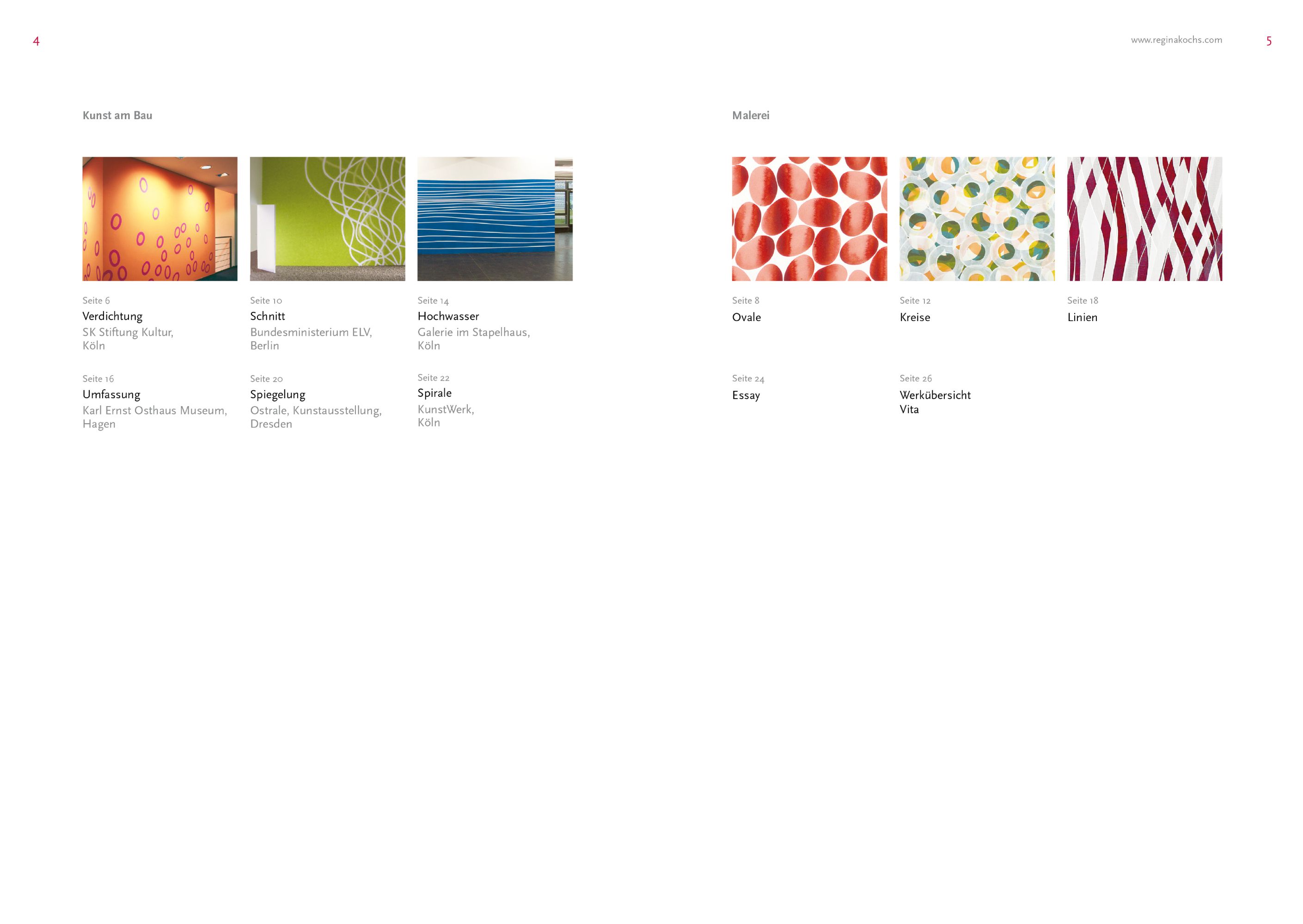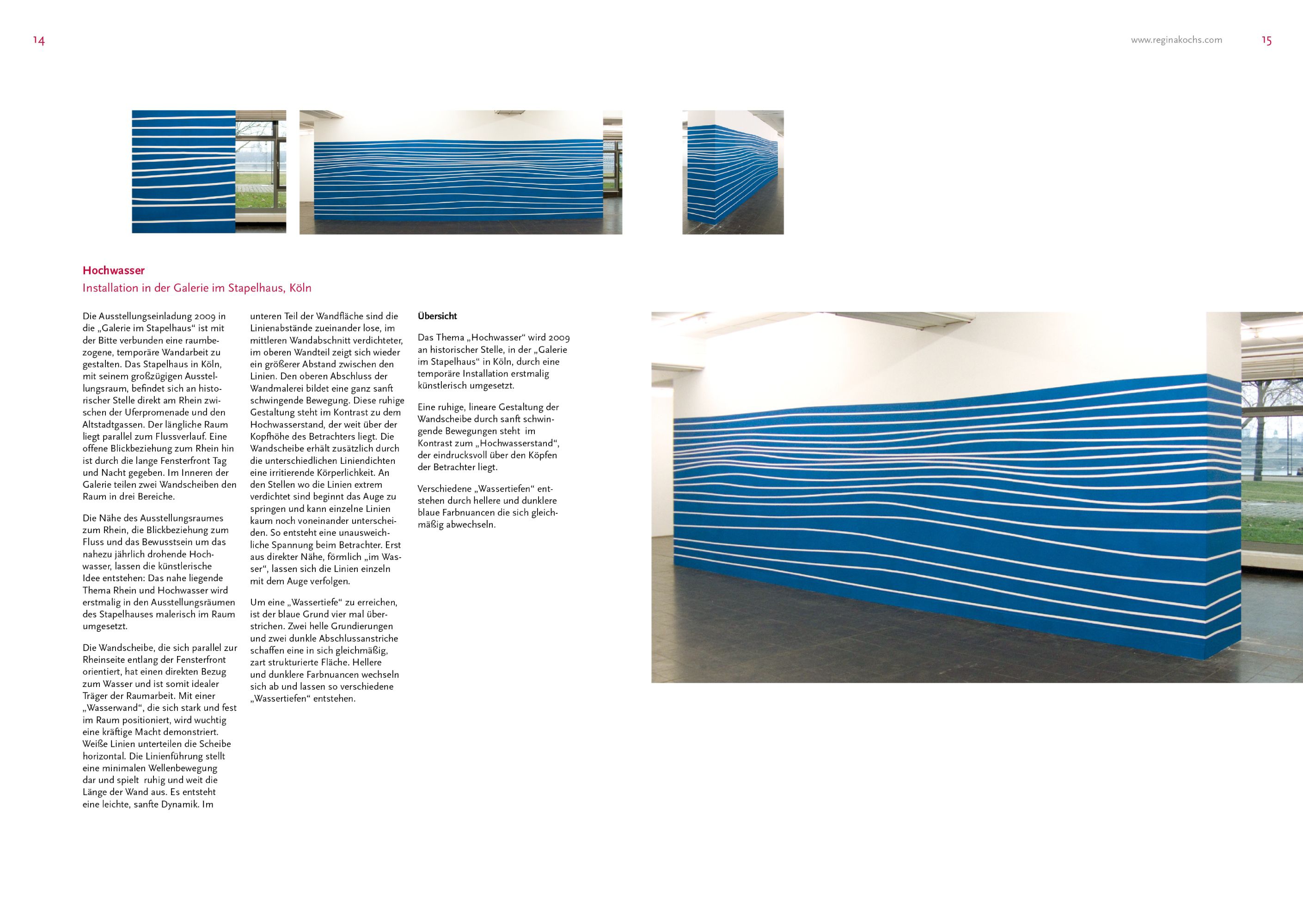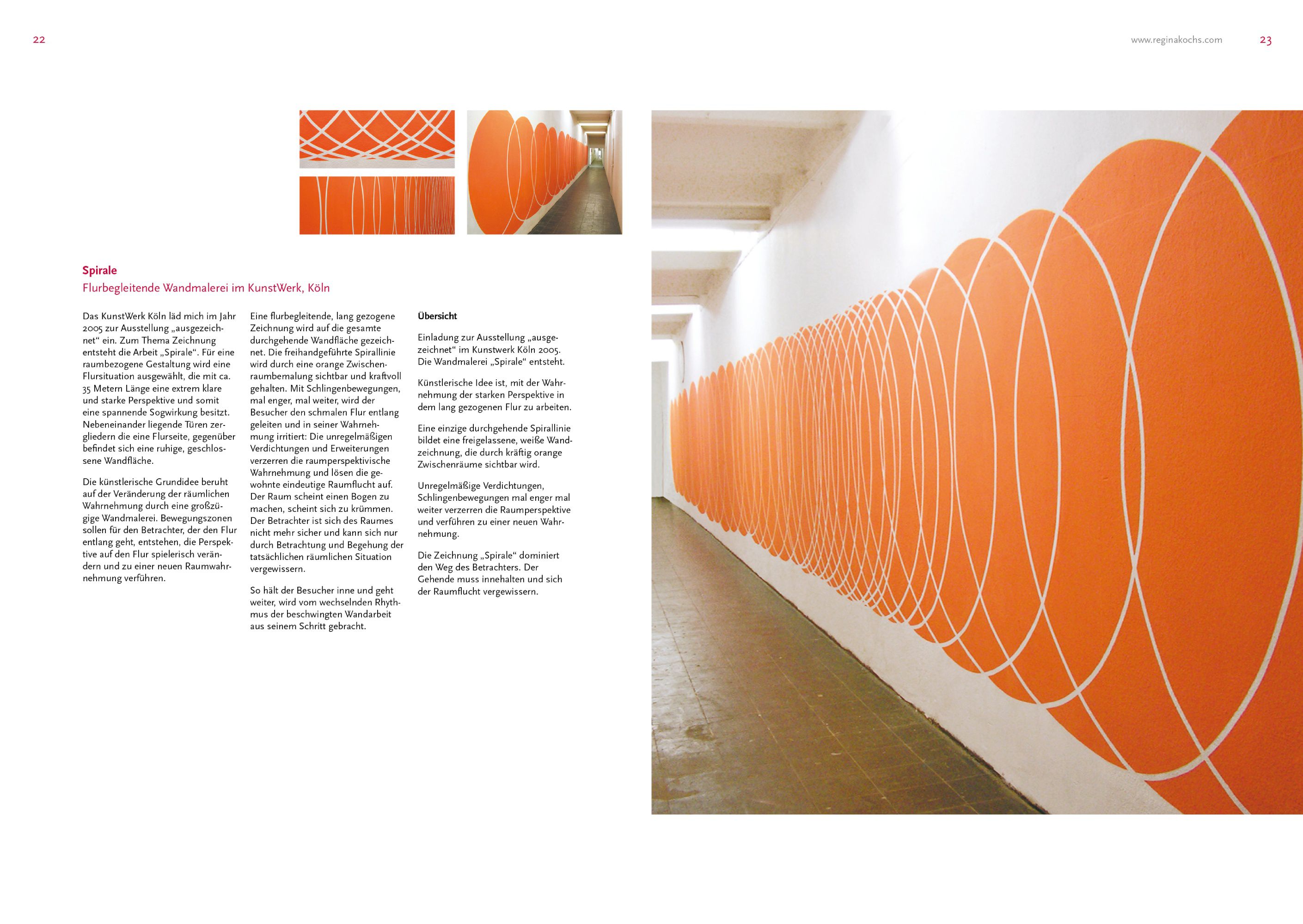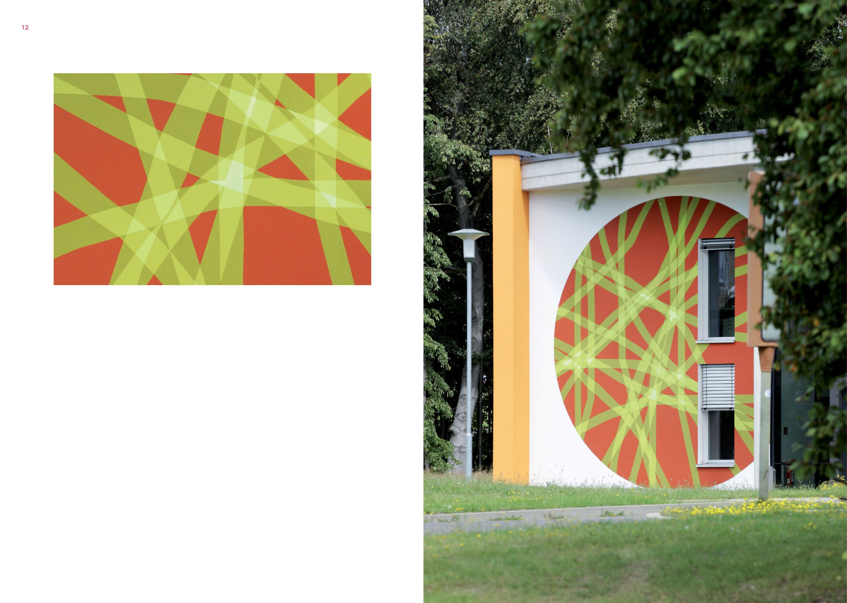 Großflächige Wandmalereien, wie die mehrgeschossige Arbeit "Verdichtung" für die Stiftung der Stadtsparkasse Köln und weitere temporäre Ausstellungs- und Wettbewerbsbeiträge sind dokumentiert. Darüber hinaus Malereien und Aquarelle, Linien, Kreise, Ovale...