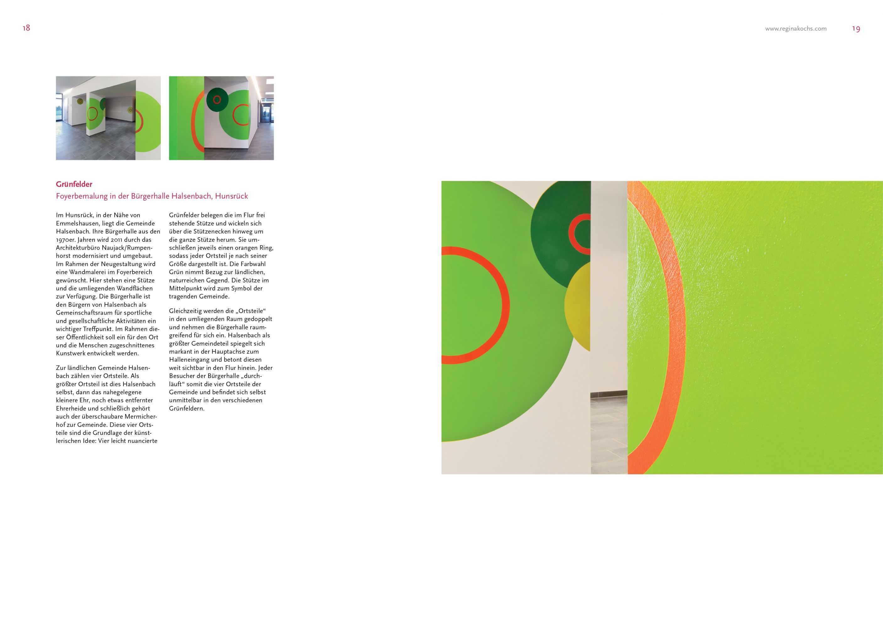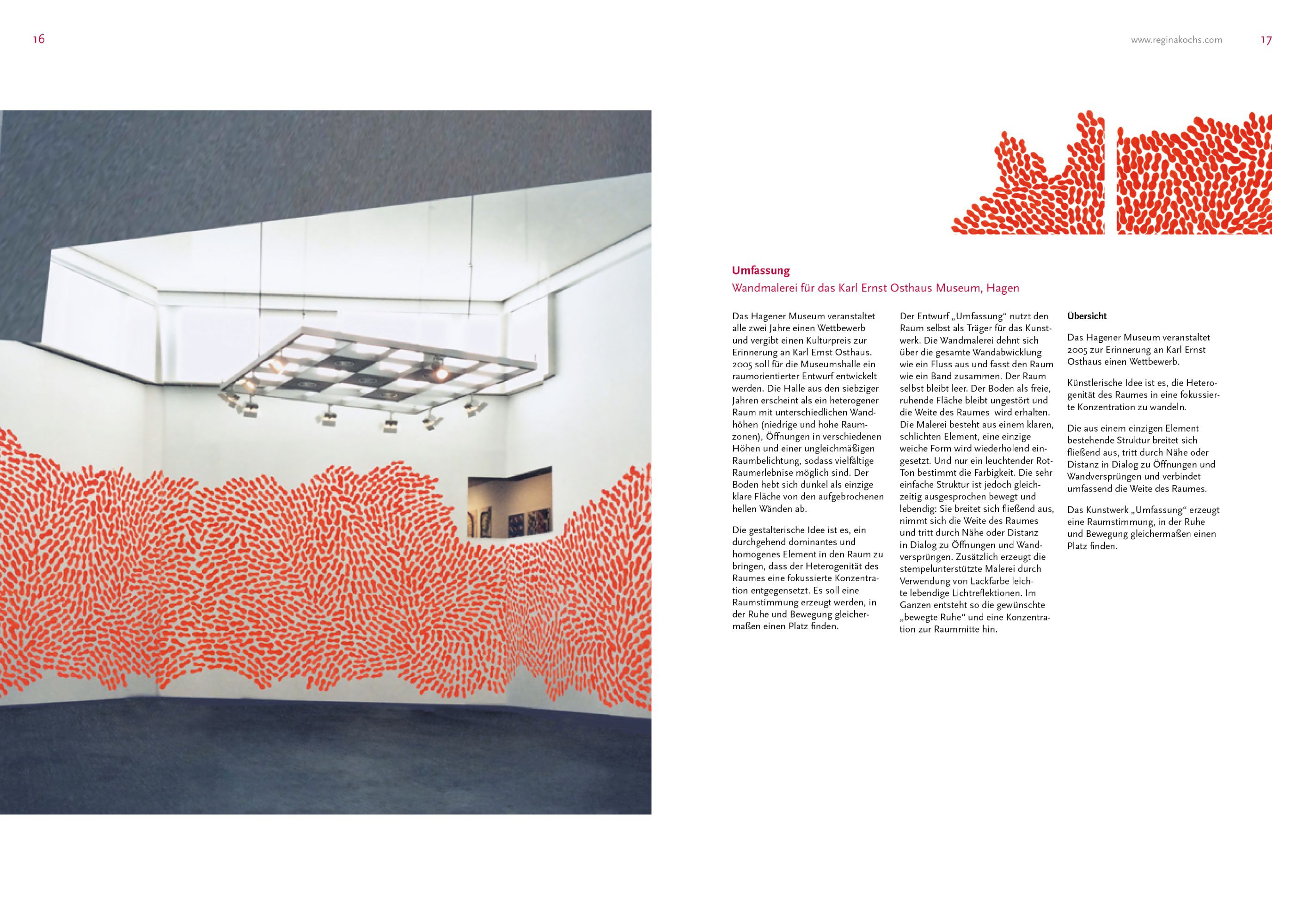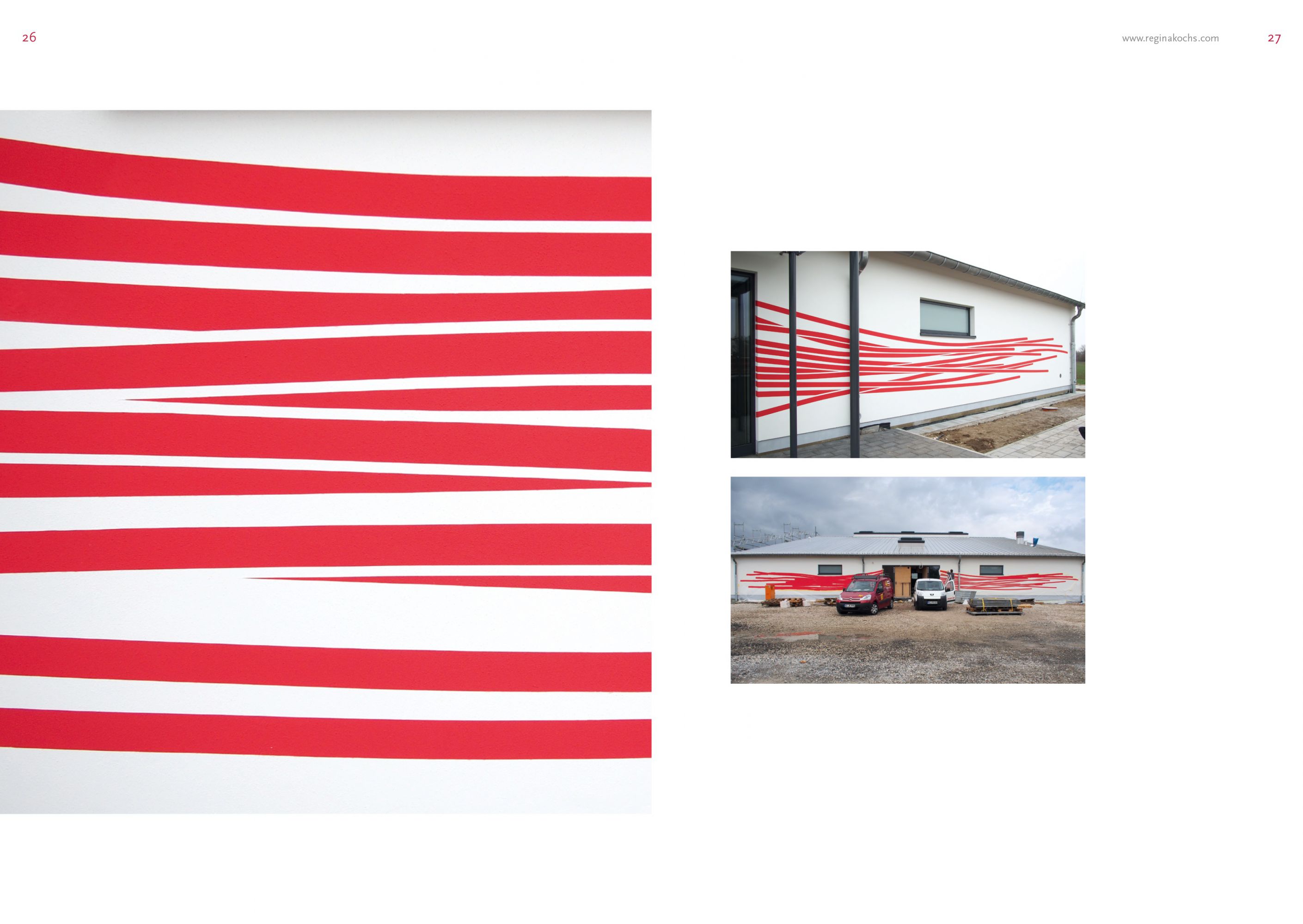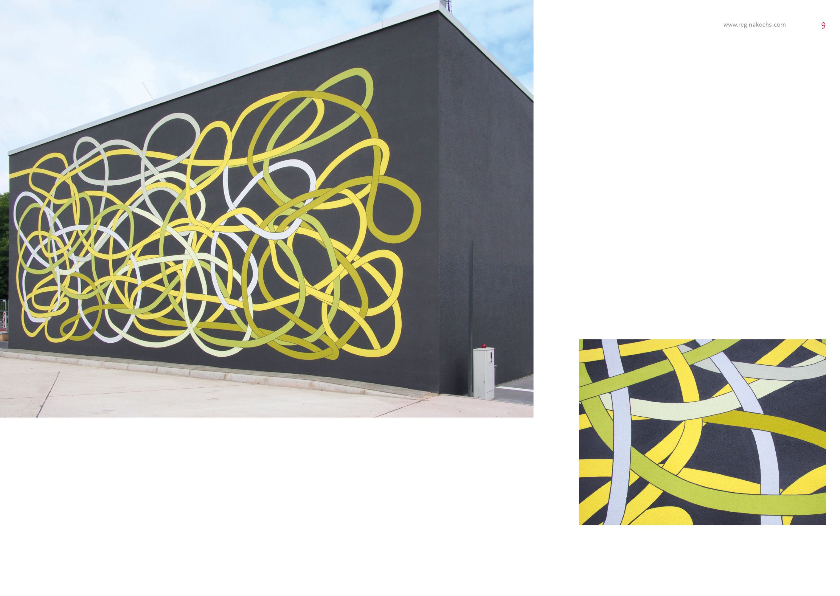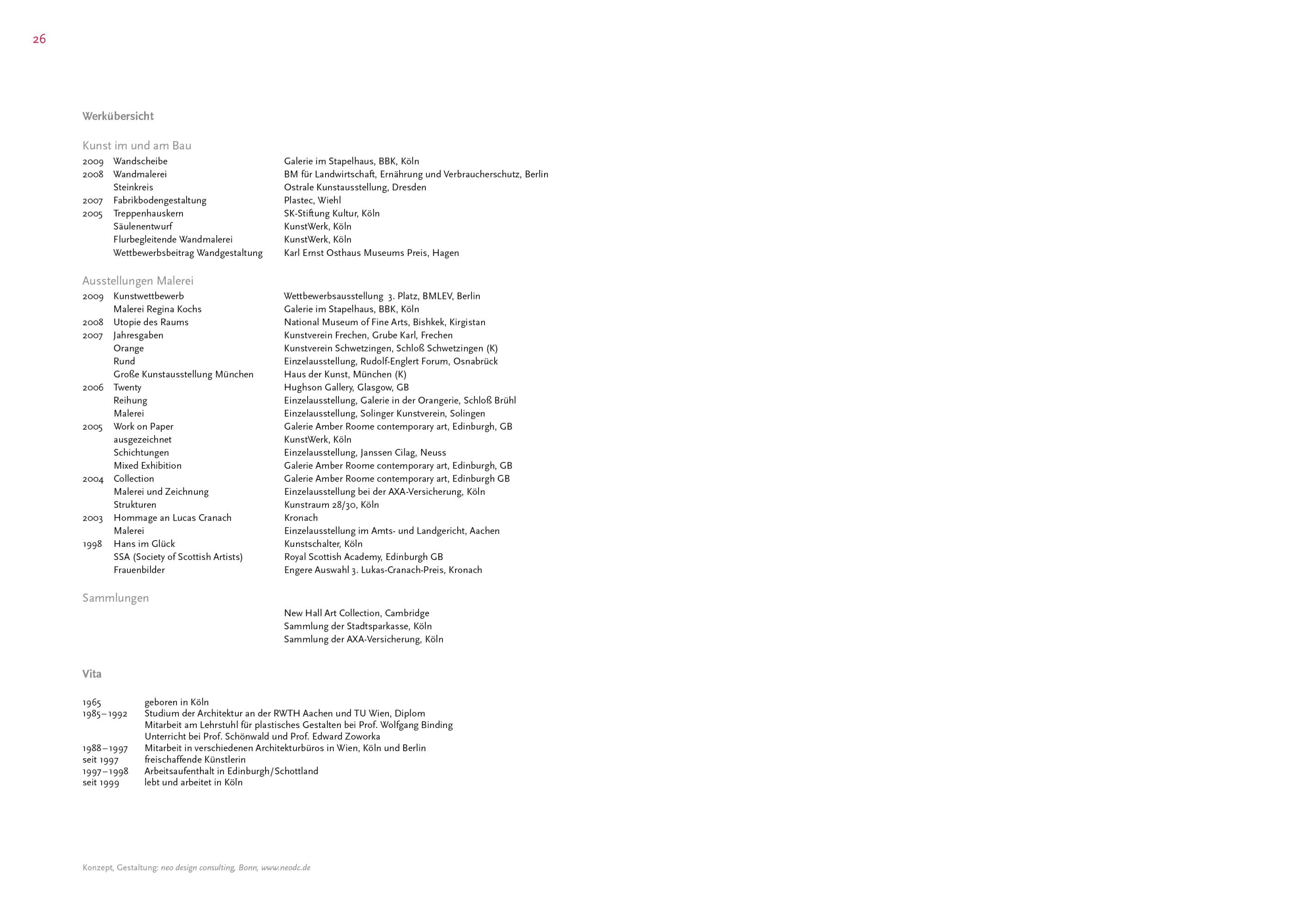 Großflächige Wandmalereien, wie die mehrgeschossige Arbeit "Verdichtung" für die Stiftung der Stadtsparkasse Köln und weitere temporäre Ausstellungs- und Wettbewerbsbeiträge sind dokumentiert. Darüber hinaus Malereien und Aquarelle, Linien, Kreise, Ovale...
